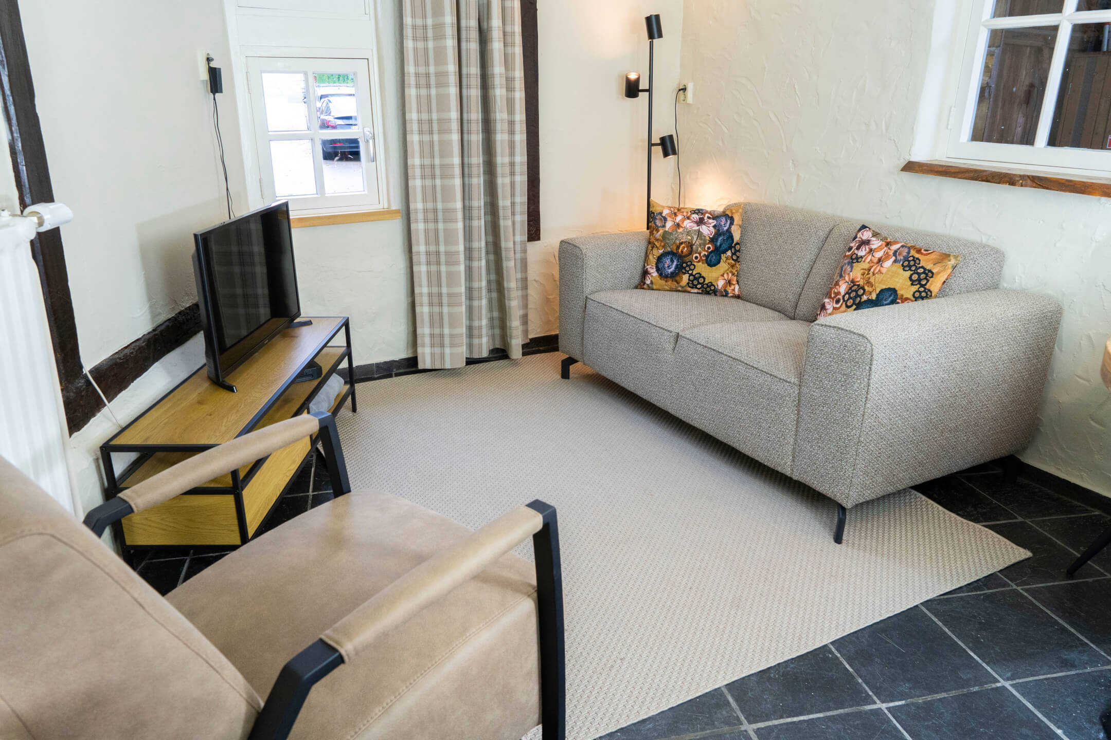 Op de begane grond is een kleine, maar gezellige woonkamer en een moderne open keuken (inclusief vaatwasser) en eethoek. Een wenteltrap naar boven leidt naar een slaapkamer met een twee-persoons bed en een kamer voor uw koffers. Hier staat ook een bureau, waar u kunt werken. De moderne badkamer is ook op deze verdieping. Deze woning ligt aan de voorkant en heeft uitzicht op de (rustige) straat en op de binnenplaats waar je heerlijk rustig kunt zitten. Maar dat kan natuurlijk ook achter de hoeve in de prachtige tuin met uitzicht op de Noorbeekse en Voerense heuvels.